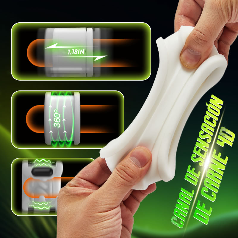 Este masturbador de diseño exclusivo ofrece un nivel de estimulación y sensaciones sin precedentes. Con un canal penetrable y mangas de doble textura, combina a la perfección movimientos telescópicos y giratorios para ofrecer una amplia gama de sensaciones emocionantes. Un extremo cuenta con una función giratoria con mangas texturizadas, mientras que el otro extremo proporciona una función de empuje con mangas texturizadas versátiles. Al introducirlo, el juguete te envolverá inmediatamente.