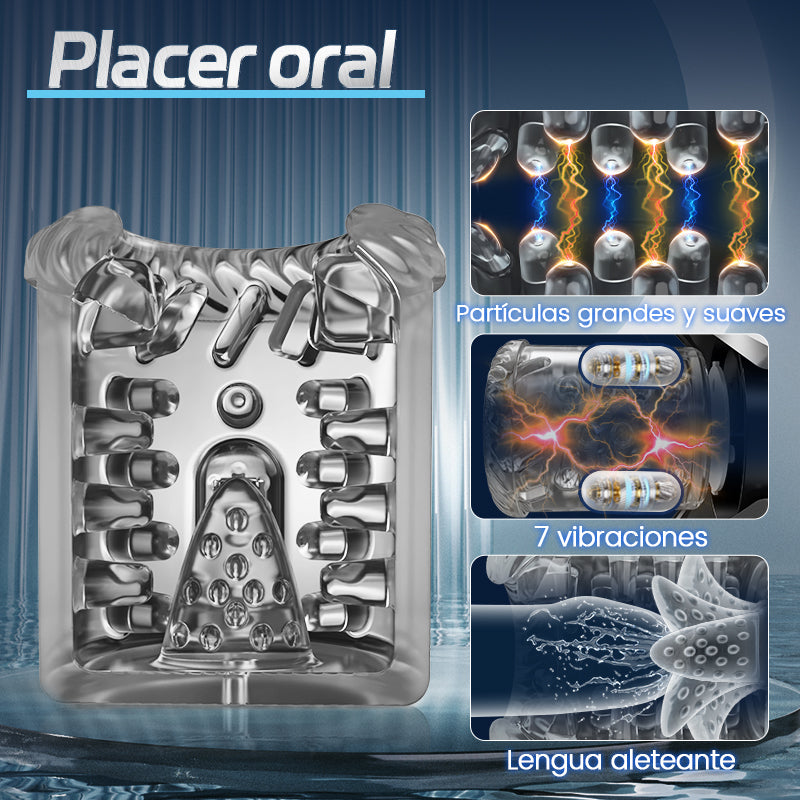 ¿Quieres relajarte después de un día agotador en la oficina? Este masturbador tiene funciones de empuje, rotación y succión vibrante que alcanzan una intensidad impresionante de 300 veces por minuto para deleitar tu cuerpo. La pantalla LCD permite un ajuste fácil en 7 modos. La funda de cristal transparente aumenta la atracción visual durante la intimidad y aumenta la excitación. La funda suave en 3D se puede ajustar para un masaje óptimo en diferentes tamaños. Mientras gira y succiona, la lengua incorporada lame el glande de manera excitante en 360 grados para un orgasmo oral inolvidable. 100% impermeable, disfruta de orgasmos en la ducha sin salir del baño.